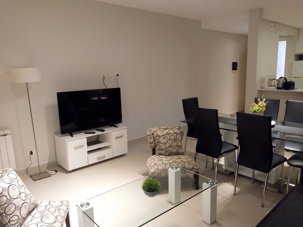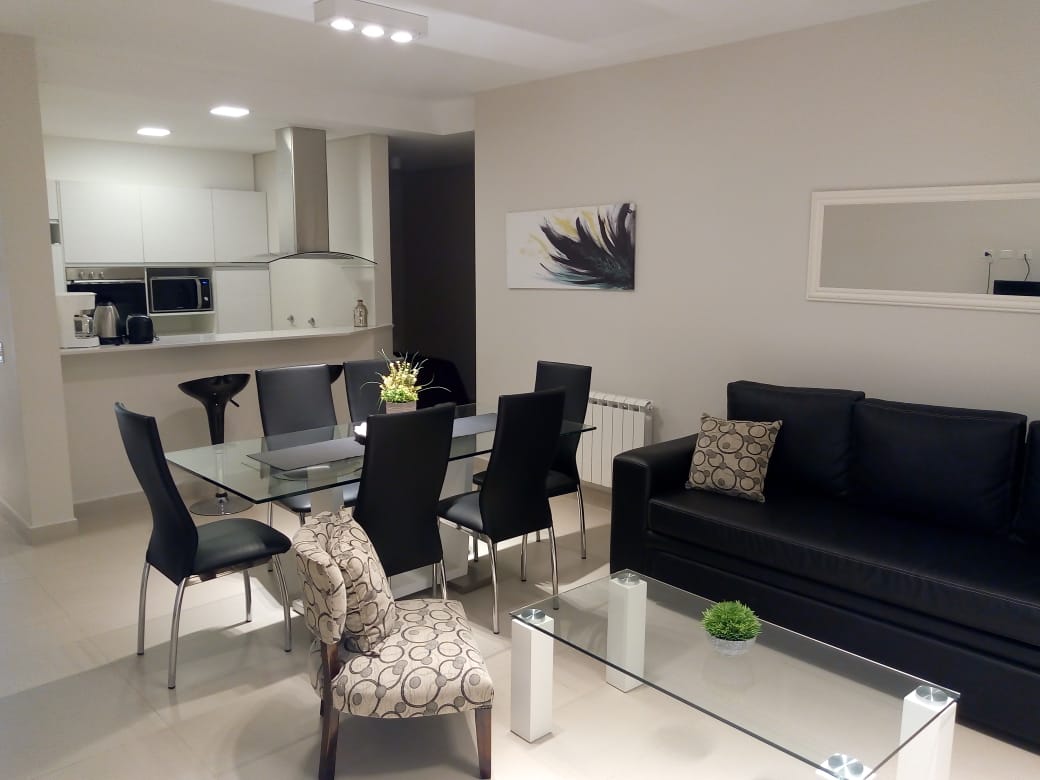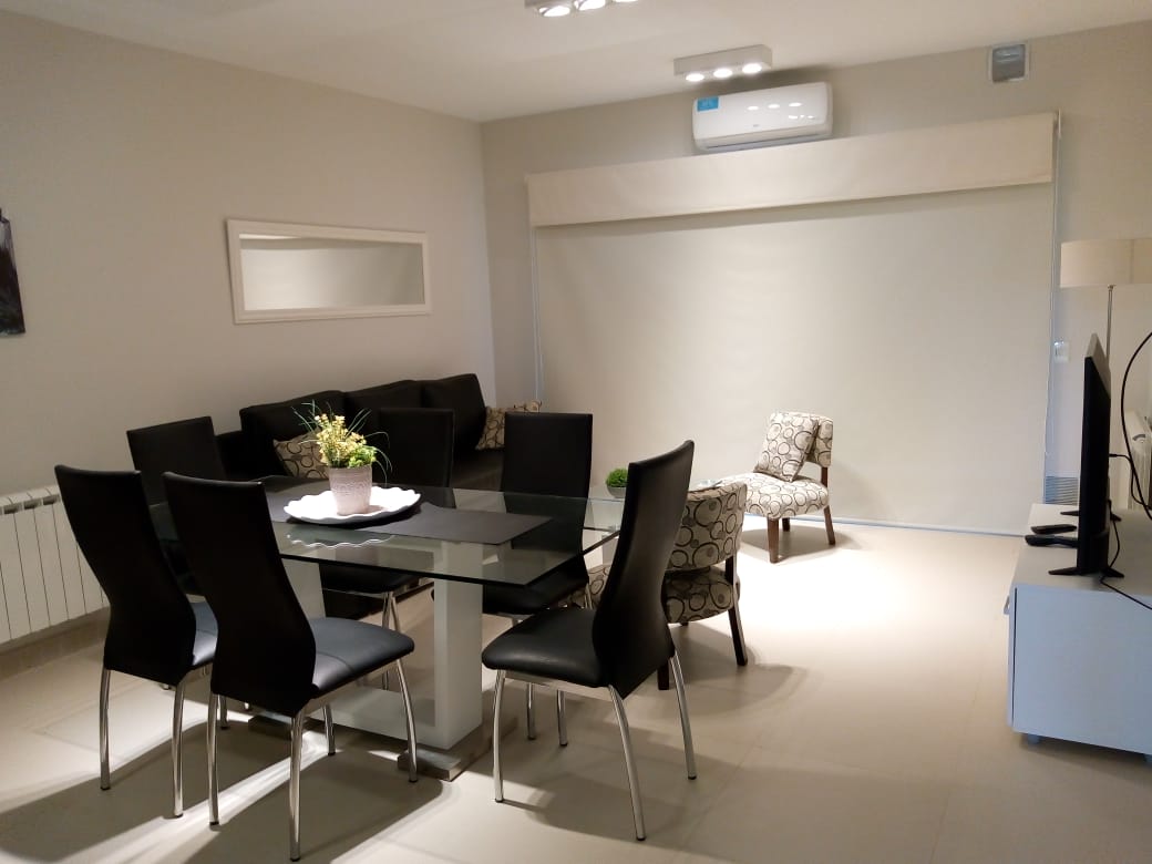 Cuenta con cocina completa, living comedor con smart de 49 pulgadas, wifi, baño completo, dormitorio con cama matrimonial y tv smart de 32, calefacción por radiadores en todos los ambientes, aire acondicionado y balcón corrido con parrilla.